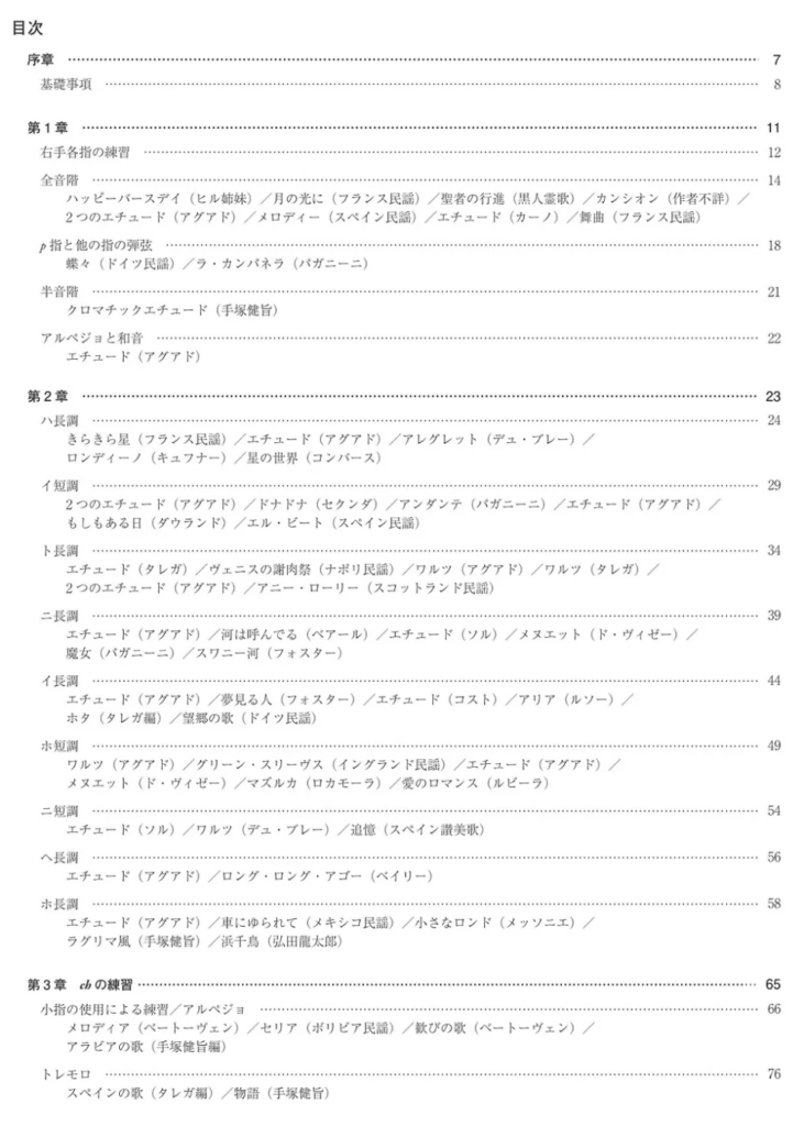 よく知られた親しみやすいメロディーが練習曲に用いられている他、アグアドやソル、タレガらのエチュードから効果的なものを採用しています。